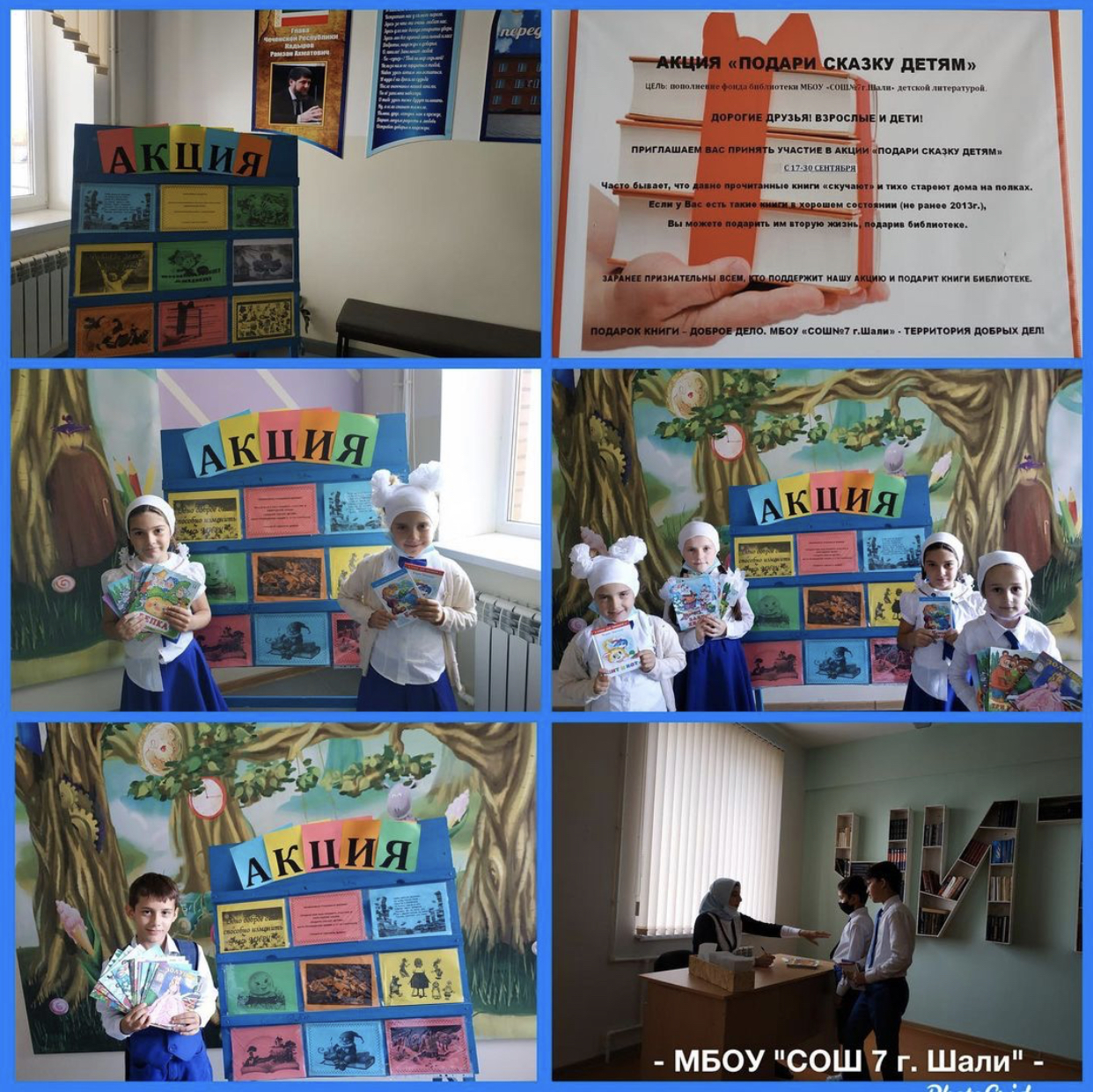 29.10.2020В преддверии Международного дня школьных библиотек в МБОУ "СОШ 7 г.Шали" прошла благотворительная акция "Подари сказку детям". С целью популяризации культуры чтения среди подрастающего поколения; пополнение фонда школьной библиотеки.