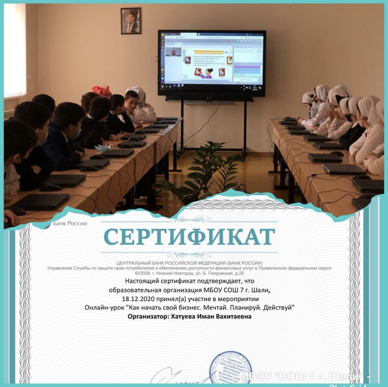 19.12.2020Обучающиеся 6-х классов МБОУ «СОШ № 7 г.Шали» под руководством заместителя директора по ИКТ Хатуевой Иман Вахитаевны приняли участие в онлайн уроке «Как начать свой бизнес. Мечтай. Планируй. Действуй». Бизнес – один из важнейших базовых элементов рыночной экономики. Только наличие знаний в этом вопросе может привести бизнесмена к успеху. На занятии ребята попытались разобраться, как превратить идею в программу действий и что нужно знать и уметь начинающему предпринимателю для того, чтобы открыть свое дело. Урок понравился ребятам. Они узнали много полезной для себя информации.