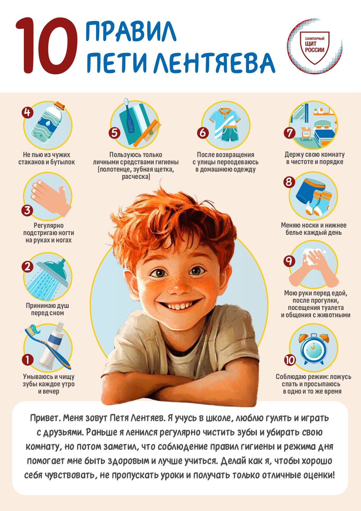 15.10.2024Привет. Меня зовут Петя Лентяев. Я учусь в школе, люблю гулять и играться друзьями. Раньше я ленился регулярно чистить зубы и убирать свою комнату, но потом заметил, что соблюдение правил гигиены и режима дня помогает мне быть здоровым и лучше учиться. Делай как я, чтобы хорошо себя чувствовать, не пропускать уроки и получать только отличные оценки!